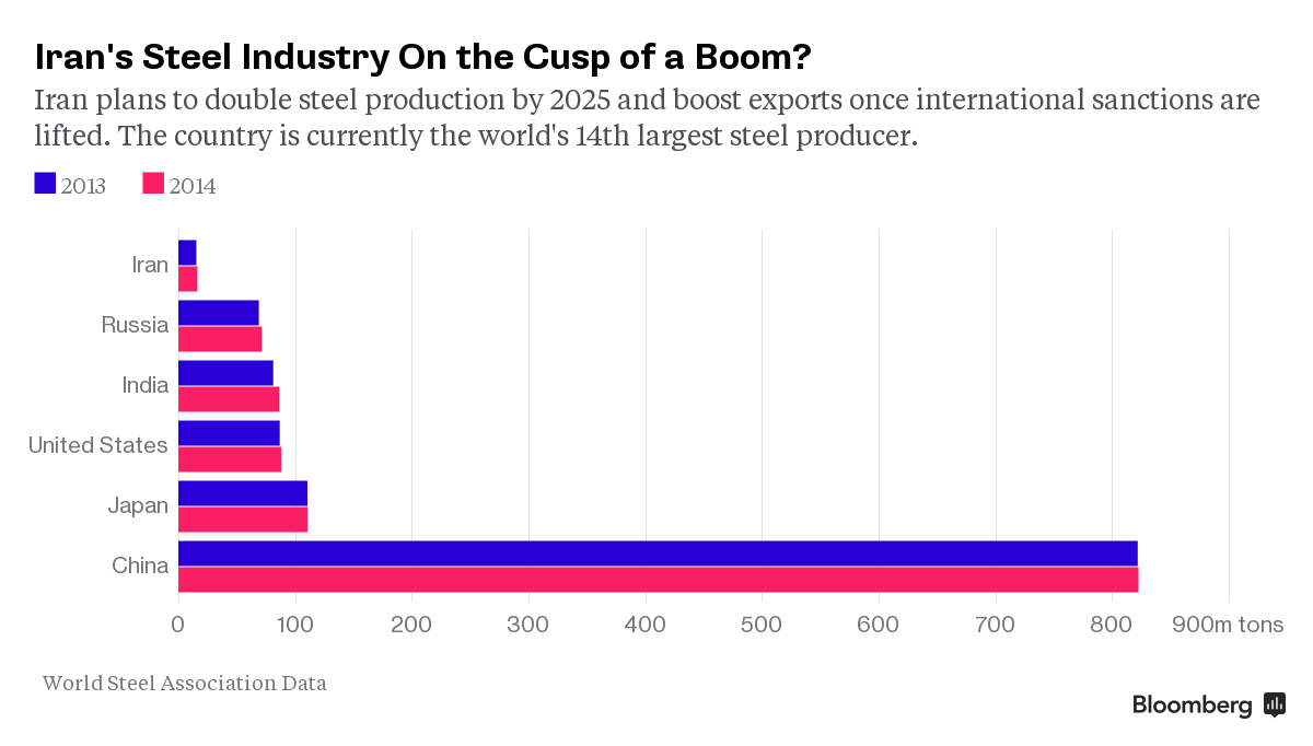 Iran has 2.7 billion tons of iron ore, used to make steel, according to Karbasian. Steel production is set to jump to 55 million tons by 2025 from 22 million tons this year, pending new investment and the end of sanctions following the nation’s nuclear accord with world powers last month, he said. Sanctions against Iran’s oil industry should be lifted by late November, Iran’s official news agency IRNA quoted Oil Minister Bijan Namdar Zanganeh as saying.