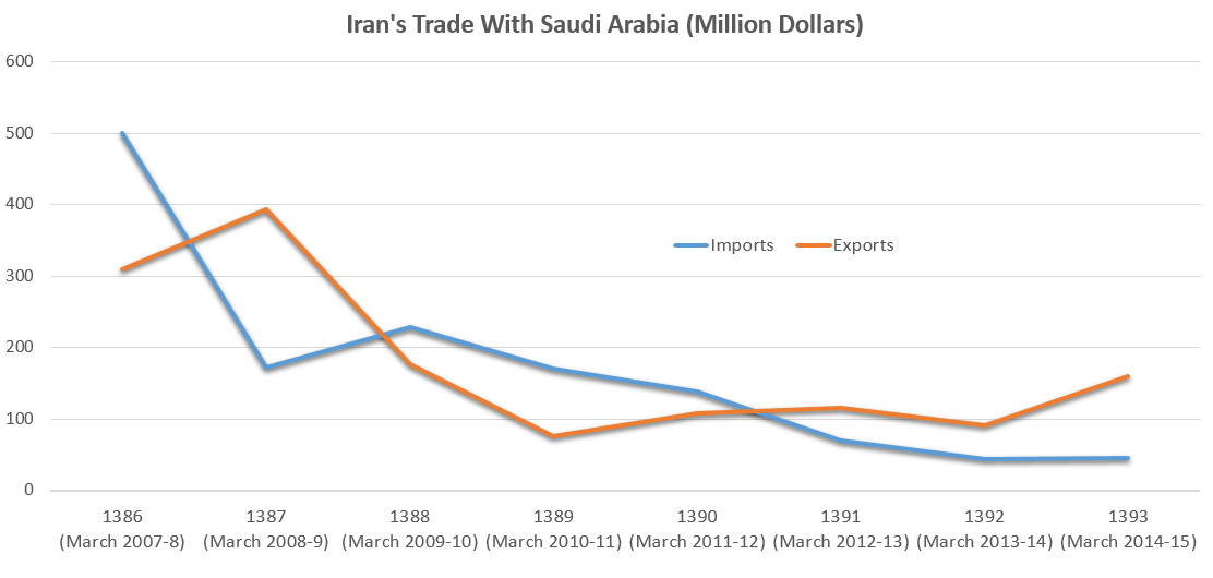 Iran-Saudi Arabia trade took yet another dive in the Iranian year that ended in March 2013. Exports to and imports from Saudi Arabia hovered around $115 million and $70 million respectively to register a 25% drop in trade volume compared to its preceding year to stand at $185 million.
