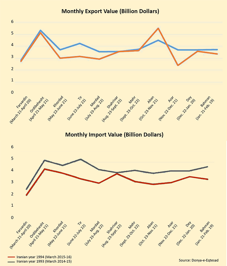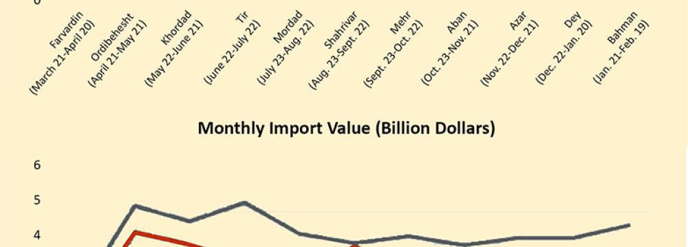 The report has added that exports and imports during the Iranian month of Bahman (ended February 19) amounted to $3.36 and $3.43 billion, recording year-on-year decline of 10% and 25% respectively.